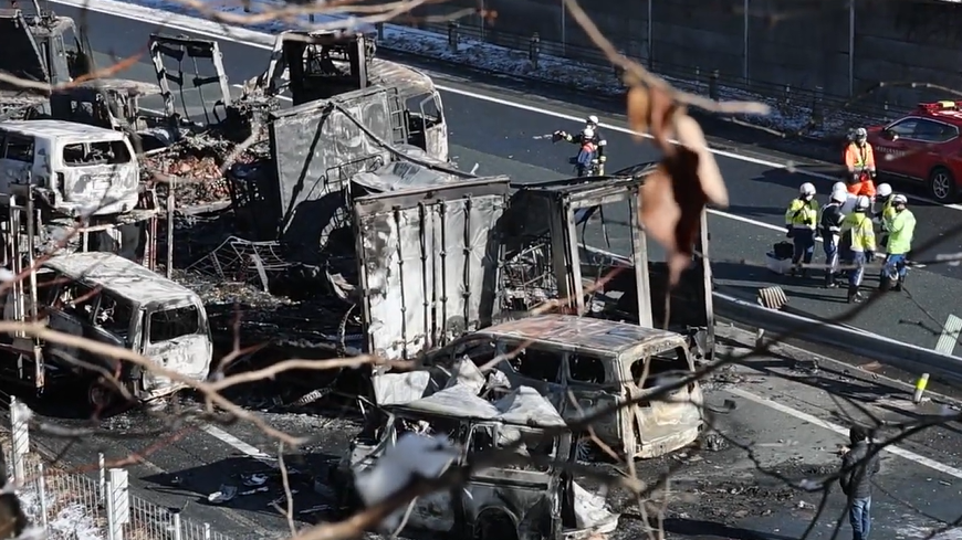 27일 일본 군마현 미나카미초(町) 칸에츠 자동차 전용도로가 전날 발생한 차량 60여대 연쇄 추돌사고로 통제되고 있다. 교도통신 유튜브 캡처