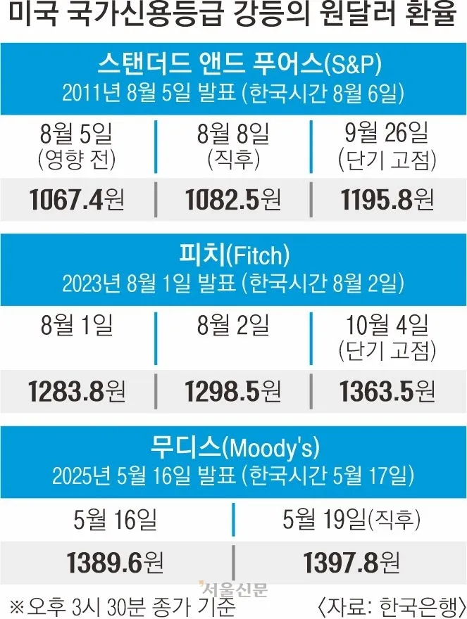 미국의 국가신용등급이 하락하면 투자자들은 위험을 회피하기 위해 미국 주식과 국채 등 자산을 팔고 기축통화인 달러를 현금으로 보유하려는 심리가 강해진다. 자연스럽게 달러 강세로 이어진다.