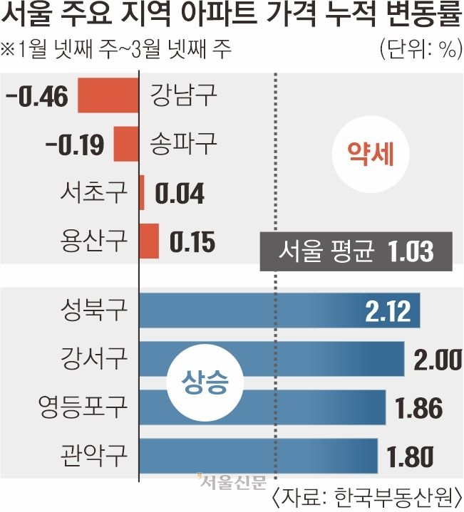 8주간 서울 전체 아파트 가격 변동률은 누적 1.03%다. 이날 KB부동산이 발표한 3월 전국 주택가격 동향에서도 서울 아파트값 상승률은 1.43%로 두 달 연속 확대됐지만, 강남구는 -0.16%로 2024년 3월(-0.08%) 이후 2년 만에 하락 전환했다.