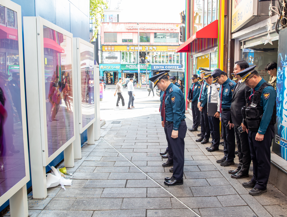 박정보 서울경찰청장과 경찰 관계자들이 핼러윈 대비기간에 앞서 ‘이태원 참사’ 현장이자 추모 골목인 서울 용산구 이태원역 1번 출구 앞에서 묵념하고 있다. 2025.10.24.