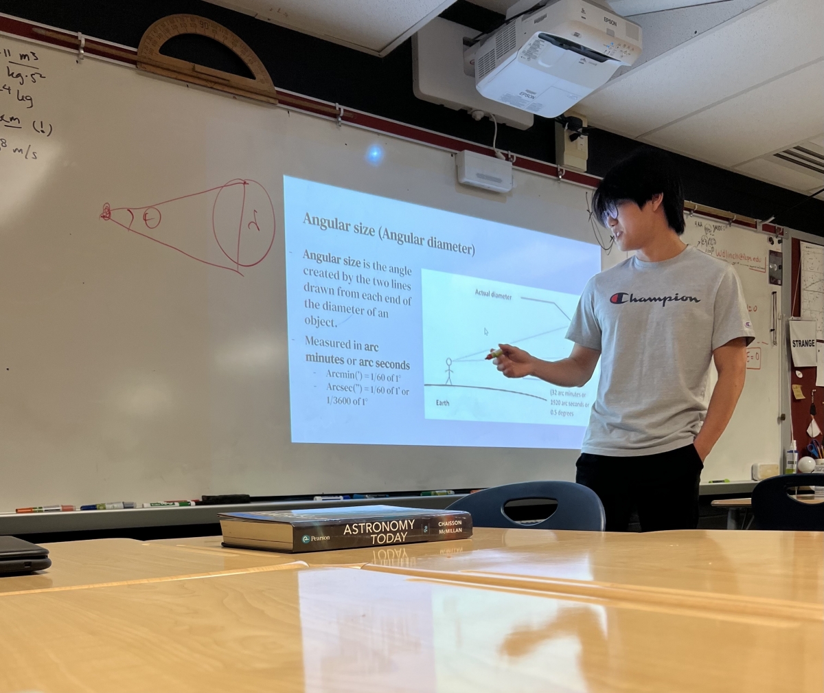 미국 버지니아주 토머스 제퍼슨 과학고에 재학 중인 이한선군이 공동회장을 맡고 있는 교내 동아리 ‘천문 올림피아드를 준비하는 클럽’에서 회원들에게 천체의 실제 크기와 거리를 파악하는 데 쓰이는 ‘시직경’(Angular Size) 원리에 대해 설명하고 있는 모습. 제퍼슨고에는 180여개의 동아리가 활성화돼 있어 학생들의 토론과 탐구활동을 돕고 있다.