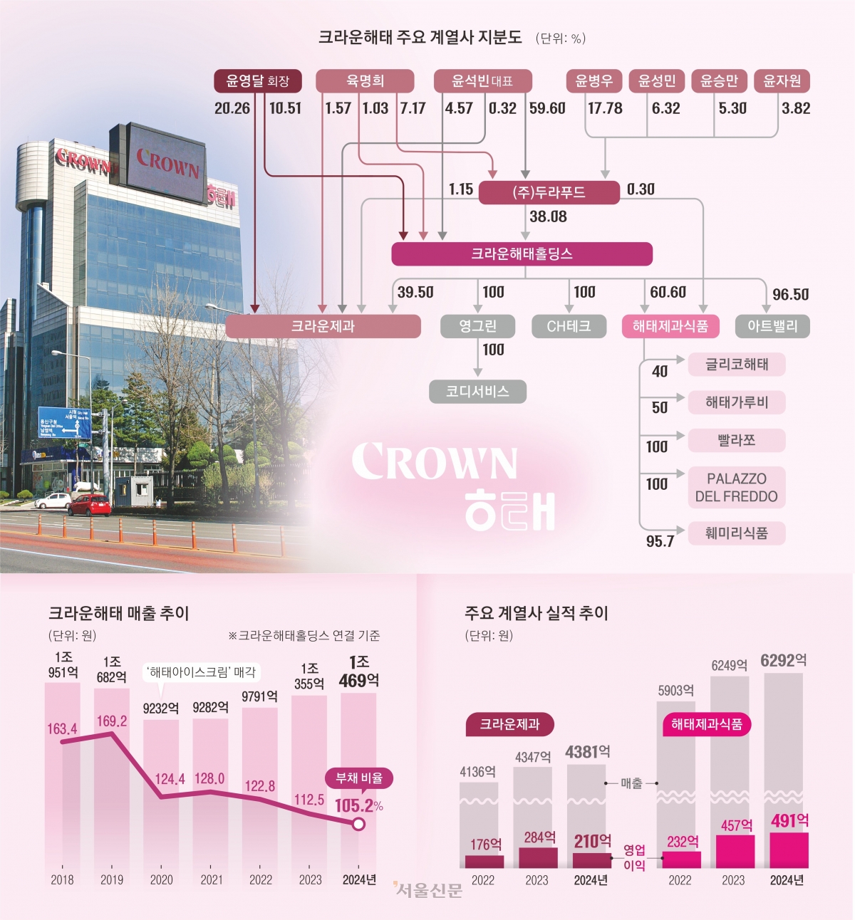 윤 회장이 여전히 활발한 대외 활동을 하고 있기는 하지만 크라운해태는 이미 ‘3세 경영’이 자리잡은 것으로 평가받는다. 윤 대표가 지주사는 물론 2020년부터 크라운제과 대표도 겸하고 있는 데다 지분 구조상 그룹 전체를 사실상 지배하기 때문이다.