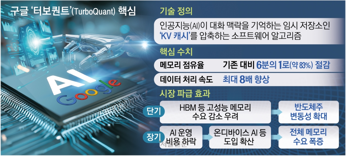 구글 리서치가 인공지능(AI) 모델의 메모리 사용량을 6분의1로 줄이는 혁신 알고리즘 ‘터보퀀트’(TurboQuant)를 전격 공개해 글로벌 반도체 시장에 파장이 일고 있다. 소프트웨어가 하드웨어 수요를 잠식할 것이라는 ‘수요 절벽’ 위기론과 시장 파이가 커질 것이라는 낙관론이 팽팽하다. 29일 핵심 쟁점을 일문일답으로 풀었다.
