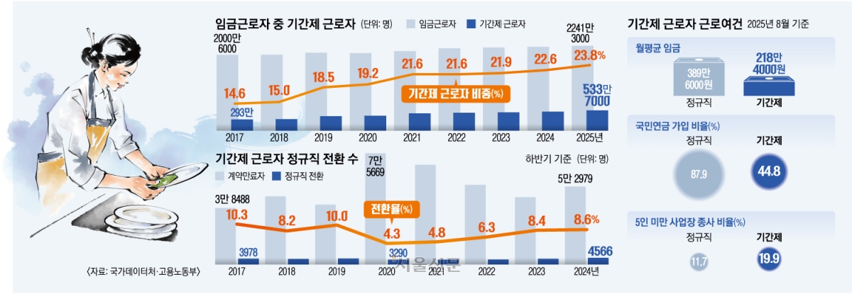 정부는 1년 미만 계약직에 대해 추가수당을 주는 방안을 검토하고 있다. 이재명 대통령이 경기지사 시절 도입한 ‘공정수당’(임금의 5~10% 지급) 정책으로, 고용 불안을 임금으로 보전하는 장치다. 1년 미만 계약을 남용할수록 비용 부담이 커지기 때문에 단기 ‘쪼개기 계약’을 줄이는 효과를 낼 수 있다. 하지만 제도가 정교하게 설계되지 않으면 기업이 수당 부담을 피하려고 계약 자체를 회피하거나 용역·프리랜서 계약만 늘리는 부작용이 나타날 수 있다.