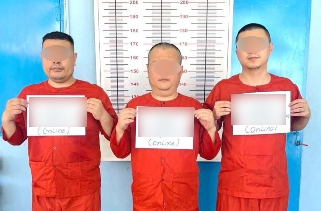 지난 11일(현지시간) 캄보디아 깜폿지방검찰청이 한국인 박모씨에 대한 살인과 사기 혐의로 구속기소한 30~40대 중국인 3명의 모습. 캄보디아 정보부 제공
