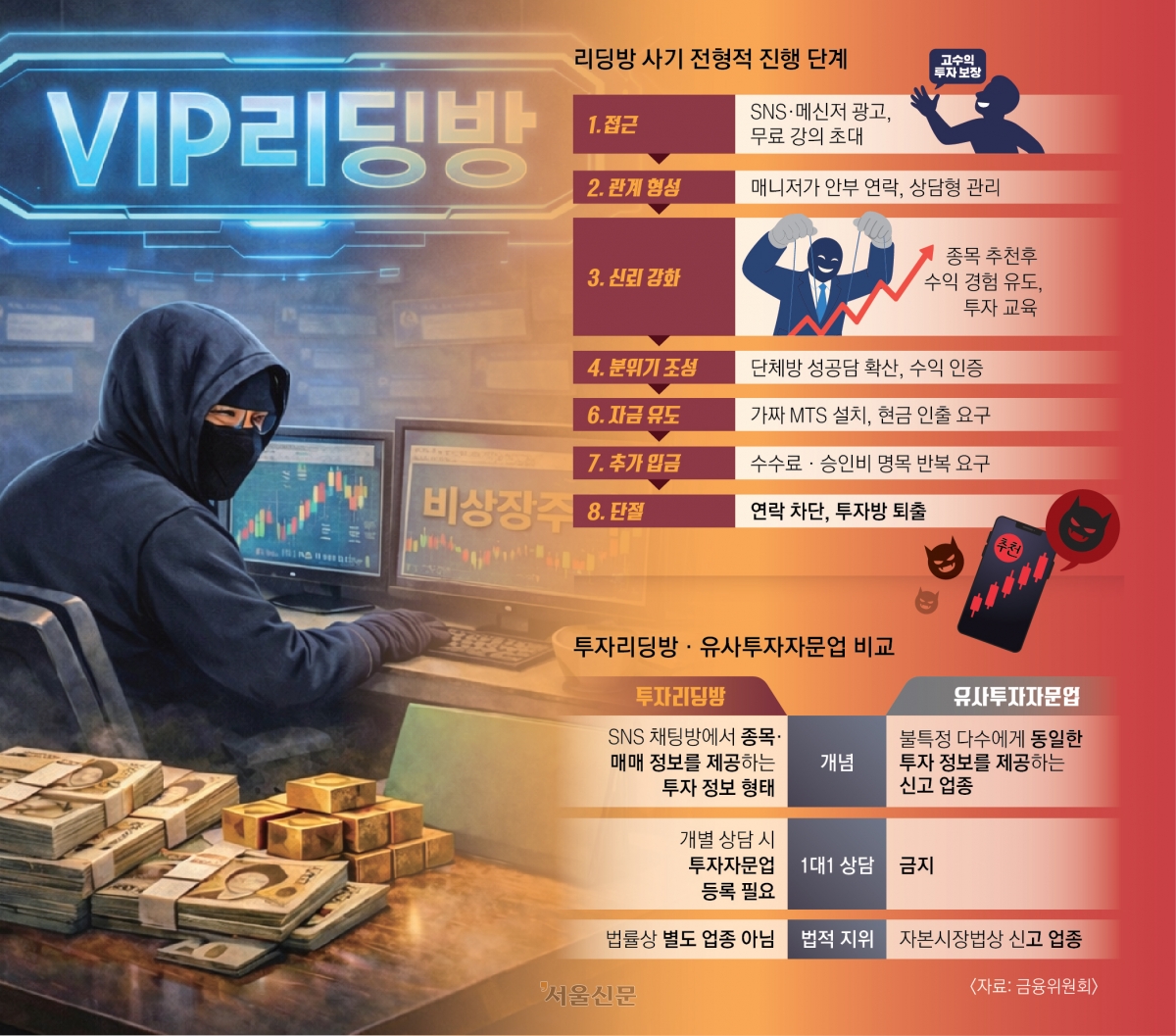 이런 사기 리딩방들은 겉으로는 ‘정보 격차를 메워 준다’고 하지만 실상은 정보의 비대칭을 더 교묘하게 이용해 자금 여력이 약한 투자자를 표적으로 삼고 있었다. 자산가들은 전담 PB와의 네트워크를 통해 ‘선별된 고급 정보’를 접하는 반면 자산이 적은 개인은 공시 외 별도 정보 창구가 마땅치 않다. 그래서 폐쇄형 메신저 속 검증되지 않은 ‘비밀 정보’에 의존하도록 내몰린다. 정보 접근력의 차이가 곧 수익률 격차로 이어지는 현실에서, 리딩방은 그 왜곡된 단면이 드러나는 현장이었다.