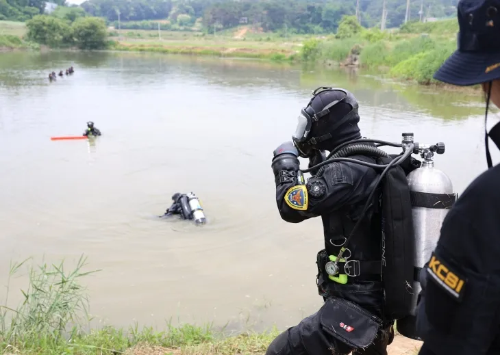 대구 스토킹 살해범에 대한 추적이 나흘째 이어지고 있는 가운데, 경찰이 그가 잠적한 충북 청주시 강내면의 야산 인근 한 저수지에서 13일 오후 수중 수색 작업을 진행하고 있다. 2025.6.13. 연합뉴스