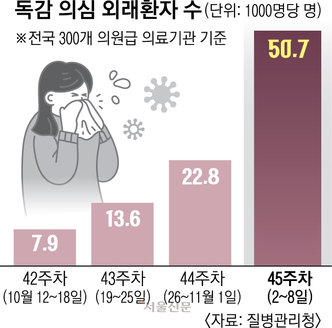 17일 시에 따르면 올해는 예년보다 약 2개월 빠른 지난달 17일에 독감 유행 주의보가 발령됐다. 질병관리청의 45주차(11월 2~8일) 표본 감시 결과 전국 300개 의원급 의료기관에서 독감 의심 증상으로 진료받은 외래환자는 1000명당 50.7명으로 집계됐다. 전년 동기 대비 12.7배 급증한 수치다.