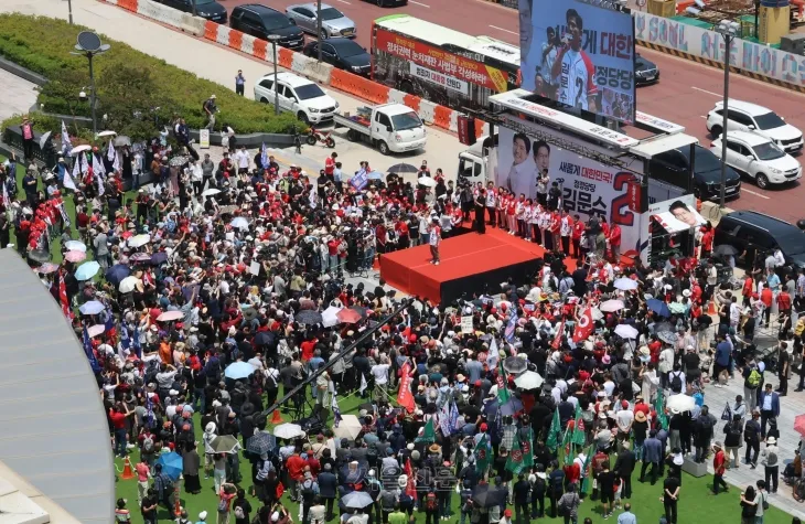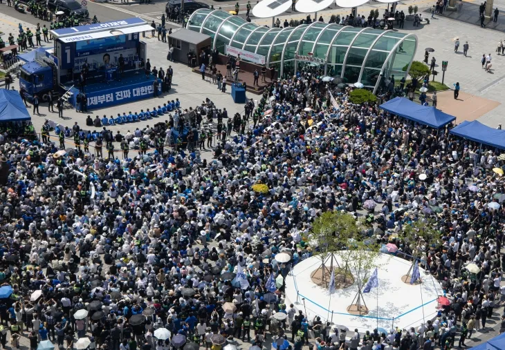 이재명 더불어민주당 대선 후보의 유세가 열린 1일 대구 동구 동대구역 광장에 시민들이 몰려 이 후보의 연설을 듣고 있다. 대구 뉴스1