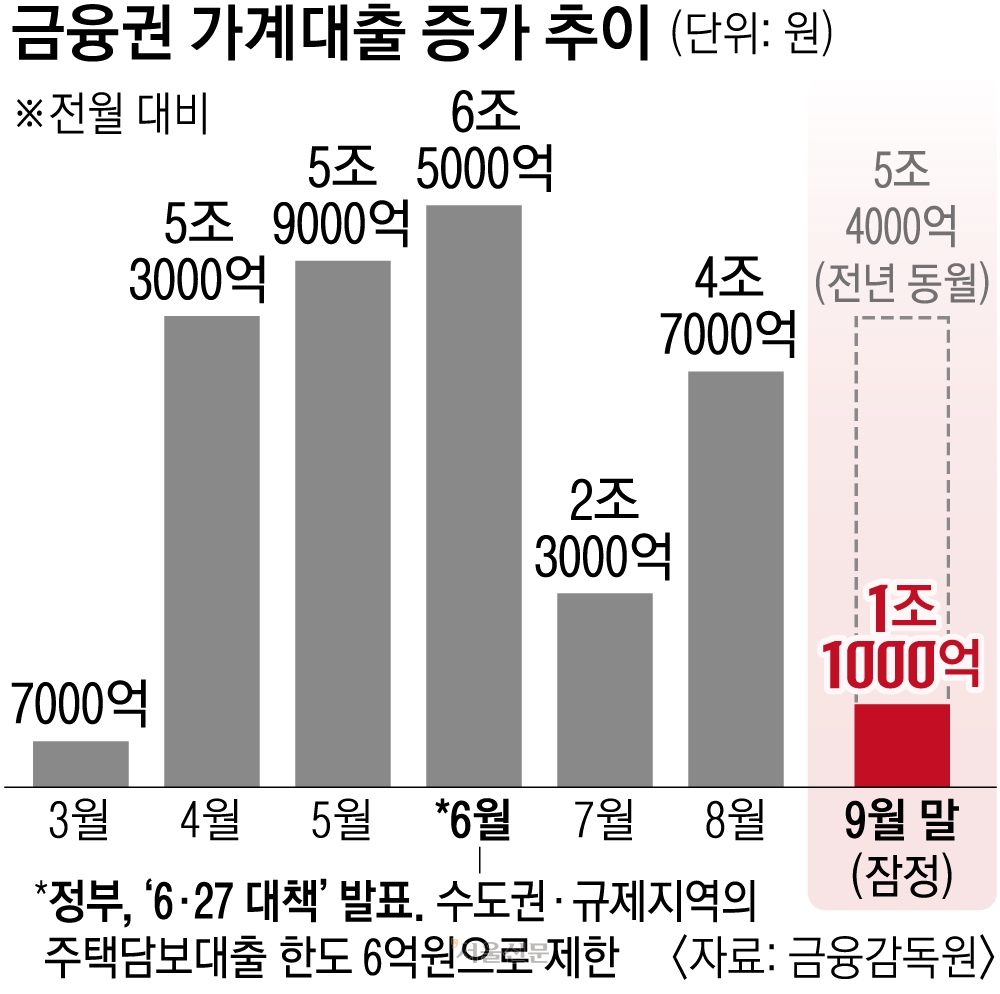 이는 6·27 대책 이후 정부가 은행의 하반기 대출 총량 목표를 절반으로 축소한 데 따른 것이다. 금융감독원에 따르면 NH농협은행과 신한은행은 9월에 이미 목표를 초과했다. 하나은행과 국민은행도 각각 목표의 95%와 85% 수준까지 근접했다.