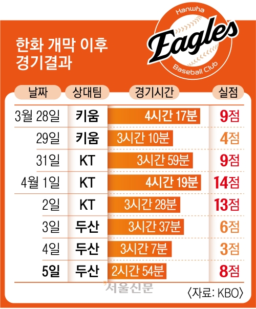 한화는 6일 기준 KBO리그 10개 팀 가운데 유일한 7점대(7.40) 평균자책점을 기록하고 있다. 한화 다음인 키움 히어로즈(6.50)보다 1점 가까이 높다. 지난 5일 두산 베어스에 8점을 내준 것을 포함해 지난주 치른 6경기에서 53점을 내주며 무너진 탓이다.
