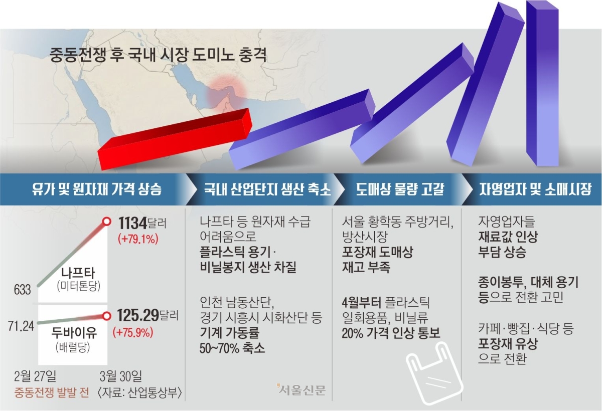 중동발 원자재 쇼크는 공장의 불을 끄고, 도매시장의 물량을 말리며, 자영업자의 비용 부담을 키우는 ‘공급망 도미노’로 확산되고 있다. 서울 용산구에서 빵집을 운영하는 신모(38)씨는 “빵 봉지 가격이 이미 20% 올랐다”며 “이대로면 종이봉투로 바꾸는 것도 고민해야 한다”고 말했다.
