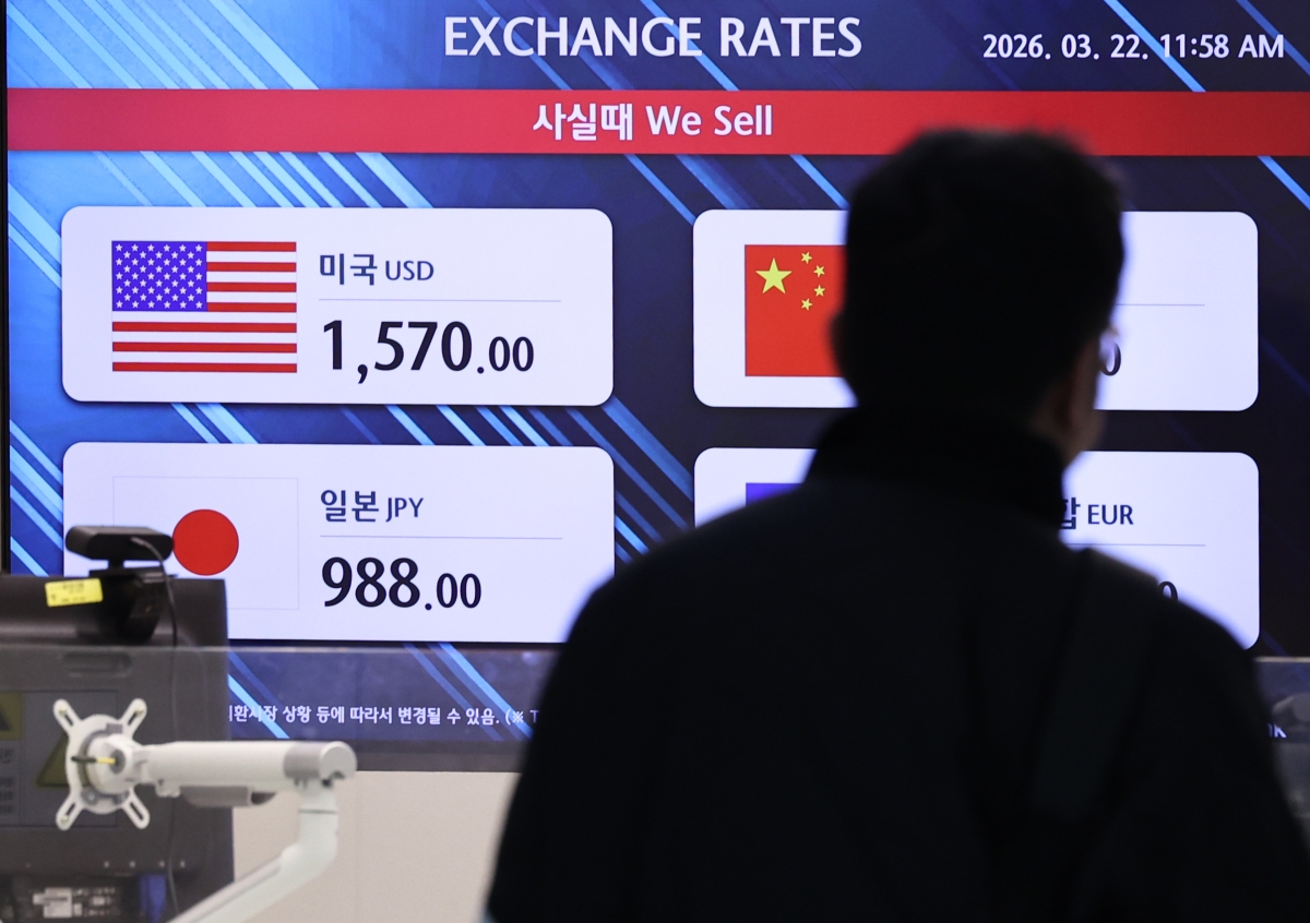중동전쟁 여파가 이어지고 있는 22일 인천국제공항의 한 환전소에 미국 달러화를 살 때 환율이 1570원으로 표시돼 있다. 서울외환시장에서 지난 20일 원·달러 환율 주간거래 종가는 1500.6원을 기록, 이틀 연속 1500원대에 마감했다.