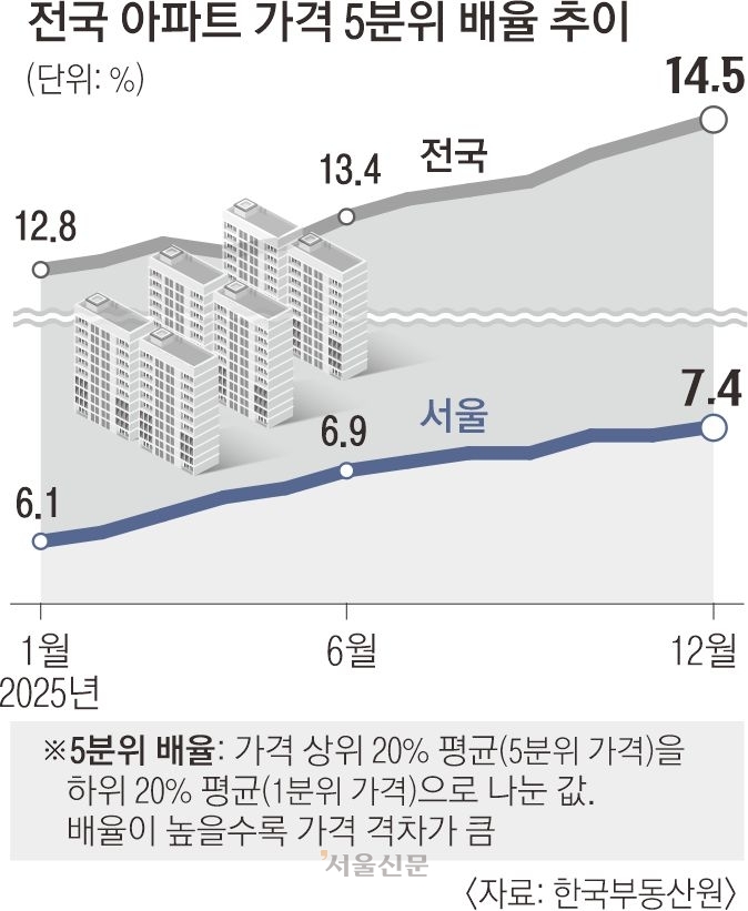 서울 주요 지역의 아파트값만 가파르게 오른 결과 지난해 전국 아파트 매매시장에서 5분위 중 최고가와 최저가의 격차가 14.5배로 벌어졌다. 이재명 대통령이 다주택자 양도소득세 중과를 부활하겠다고 밝힌 가운데 ‘똘똘한 한 채’를 보유하려는 경향이 커지면서 상대적으로 저가 매물만 쏟아질 경우 외려 주택 양극화가 심화할 것이라는 우려가 나온다.