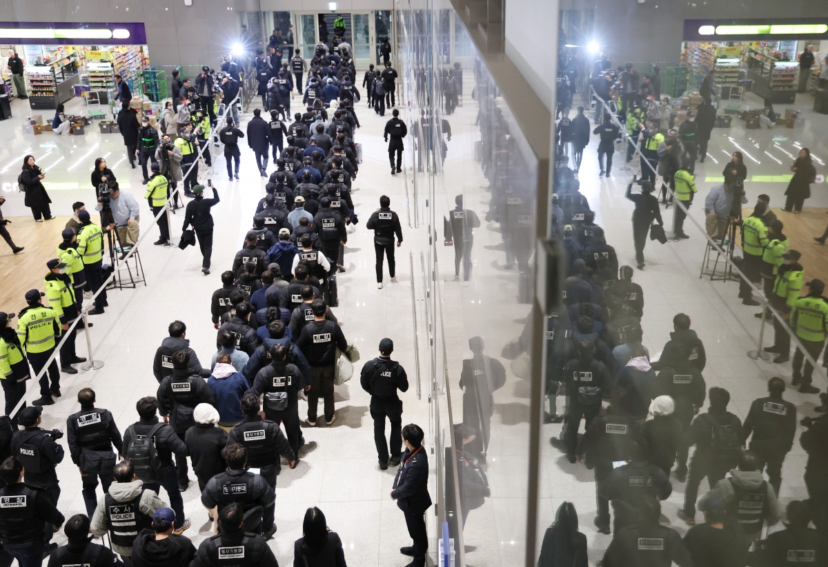 캄보디아에서 스캠(scam·사기), 인질강도 등 범행을 저지른 한국인 범죄 조직원들이 23일 인천국제공항을 통해 국내로 송환돼 수사기관으로 압송되고 있다. 2026.1.23. 연합뉴스