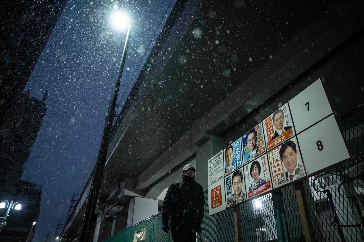 8일 가나가와현 가와사키에서 눈이 내리는 가운데 한 남성이 중의원 선거 후보들의 선거 포스터 옆을 지나가고 있다.