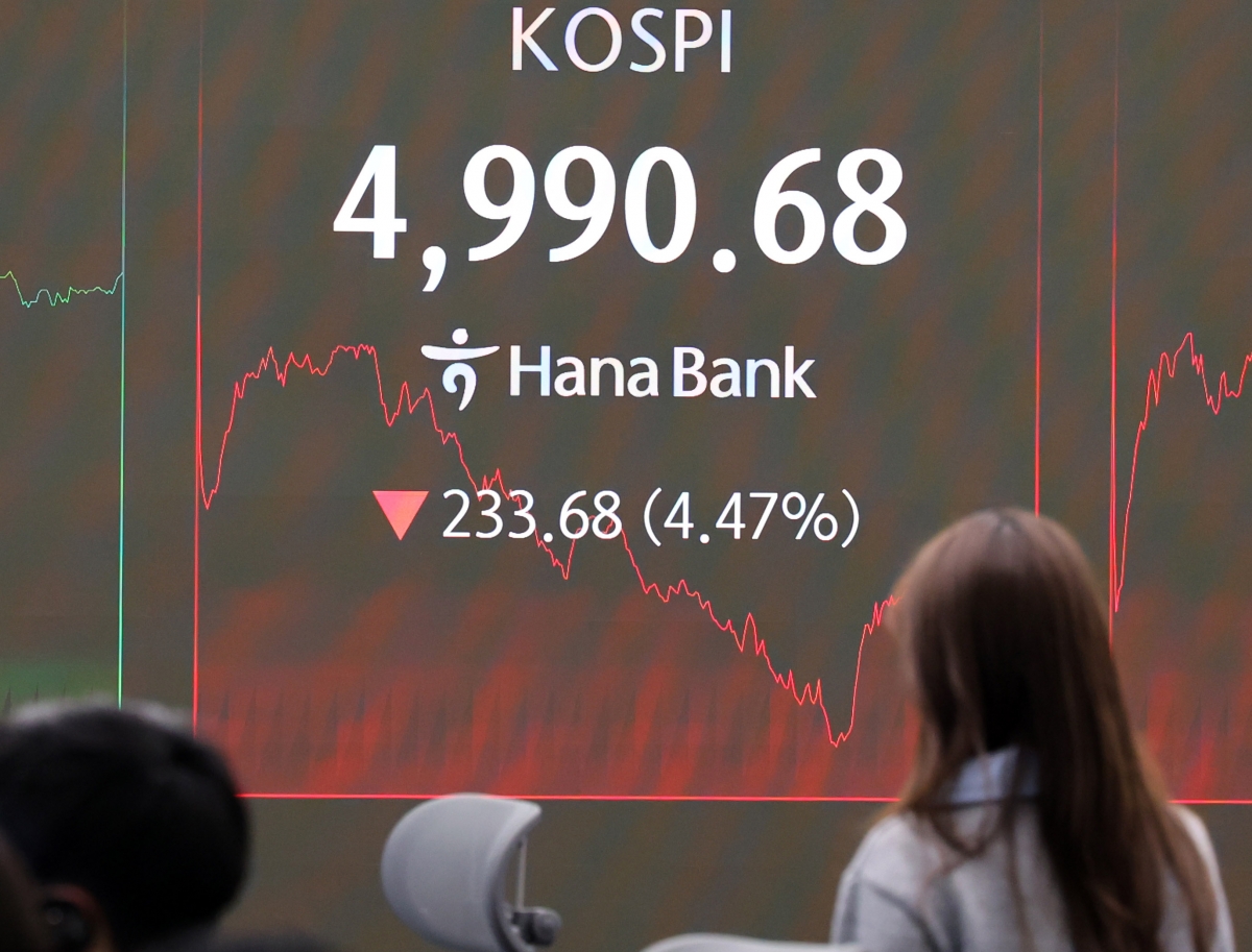 코스피 장중 5000선 아래로 장중 올해 첫 매도 사이드카가 발동되는 등 코스피가 급락한 2일 오후 서울 중구 하나은행 딜링룸 전광판에 코스피가 전 거래일 보다 233.68 포인트(4.47%) 내린 4990.68 포인트를 나타내고 있다. 2026.02.02. 뉴시스