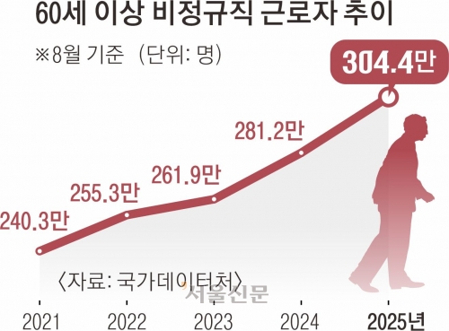 60세 이상 비정규직 근로자가 처음 300만명을 넘어섰다. 정규직과 비정규직 간 임금 격차는 180만원을 웃돌며 역대 가장 크게 벌어졌다.