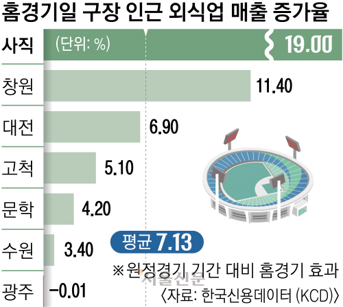 22일 한국신용데이터(KCD)가 올해 KBO 프로야구 정규시즌(3월 22일~10월 4일) 동안 전국 9개 야구장 반경 1.5㎞ 이내 외식업 사업장의 카드 매출을 분석한 결과, 홈경기 기간 일평균 매출은 원정경기 기간 대비 평균 7.1% 증가했다. 단일 구단이 홈팀인 구장은 원정경기 기간에 해당 구장에서 경기가 열리지 않는 점을 고려해 비교했다.