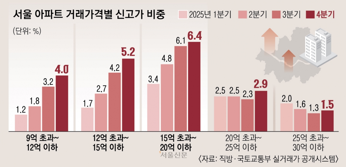 하지만 신고가 거래는 지역별로 차이를 보이며 이어졌다. 서울의 경우 가격 상단은 비교적 견고하게 유지됐지만 신고가가 형성되는 중심 가격대가 중고가로 이동했다. 지난해 1분기의 경우 아파트 가격 ‘15억원 초과~20억원 이하’ 구간의 신고가 비중은 3.4%였고, 30억원 초과 구간이 3.7%였다. 고가 아파트에서 신고가 거래가 상대적으로 많았다.