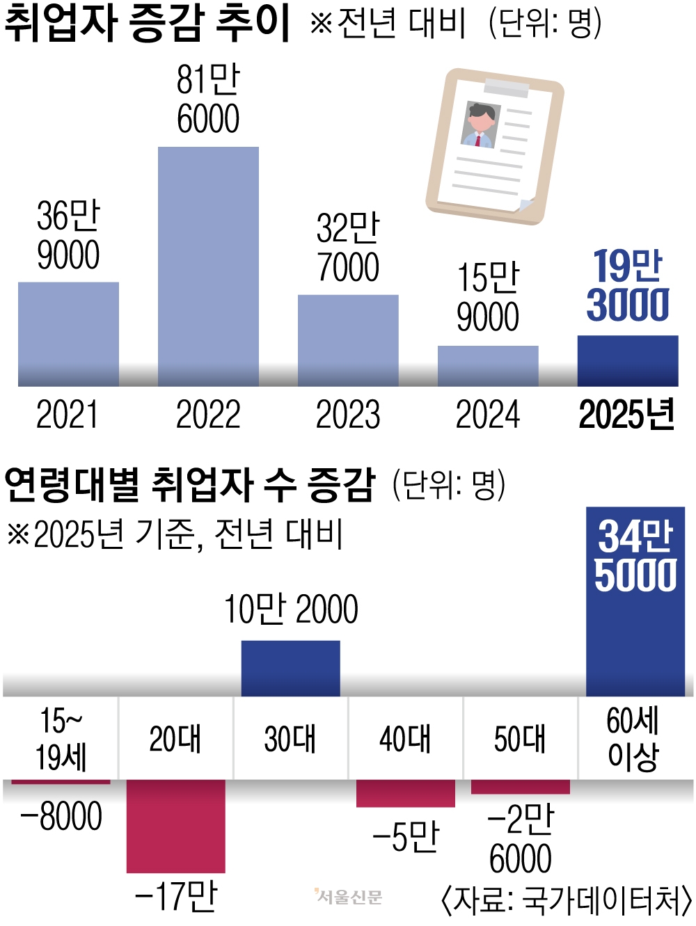 국가데이터처가 14일 발표한 ‘2025년 12월 및 연간 고용동향’에 따르면 지난해 연간 취업자 수는 2876만 9000명으로 전년보다 19만 3000명(0.7%) 늘었다. 취업자 증가 폭은 2023년 32만 7000명에서 2024년 15만 9000명으로 줄어든 데 이어 2년 연속 10만명대에 머물렀다. 60세 이상이 가장 많은 34만 5000명 늘었고, 30대가 10만 2000명으로 뒤를 이었다. 반면 20대는 17만명, 40대는 5만명, 50대는 2만 6000명씩 줄었다.