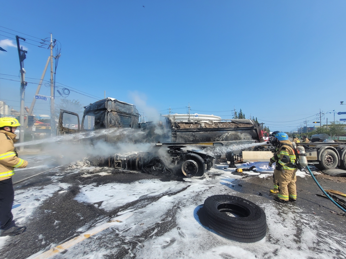 또 사고 직후 불이 나면서 덤프트럭과 트레일러가 모두 탔다. 이들 차량에서 흘러나온 경유가 도로를 덮어 방제 작업도 진행됐다.