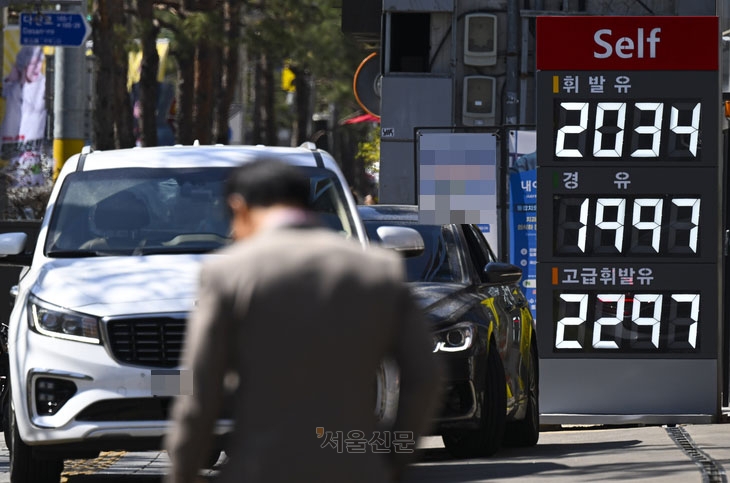 휘발유값 2000원 넘었다 서울 지역 휘발유 평균 가격이 7일 ℓ당 2003.52원을 기록하며 2000원대에 진입했다. 경유는 1984.33원으로 2000원대 진입을 눈앞에 뒀다. 사진은 이날 서울의 한 주유소가 휘발유를 ℓ당 2034원에, 경유를 1997원에 판매 중인 모습.
