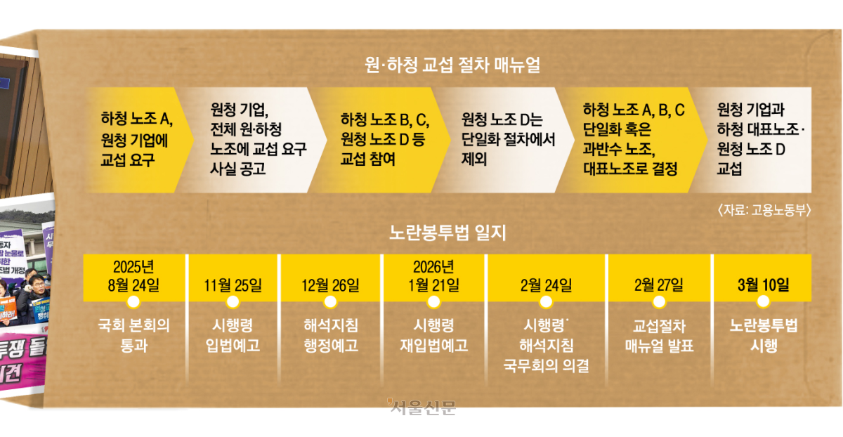 A. 하청 노조의 교섭 요구는 이미 시작됐다. 올해를 ‘원청 교섭 쟁취의 원년’으로 선언한 민주노총 산하 금속노조 26곳에 속한 하청업체 147곳 근로자 7145명이 현대자동차·기아, 한화오션 등 원청 14곳을 대상으로 공문을 보내 교섭을 요구한 상태다. 경총 등 경제 6단체는 정부를 상대로 노란봉투법 시행 연기와 완화법 제정을 촉구 중이다. 노란봉투법 첫 적용 사례는 하청 노조가 교섭을 요구하고 사용자가 공고하는 과정을 거쳐 4월 중순쯤 나올 것으로 예상된다. 김영훈 노동부 장관은 “올봄에 춘투(春鬪)가 아닌 봄의 대화가 만개하길 바란다”고 말했다.