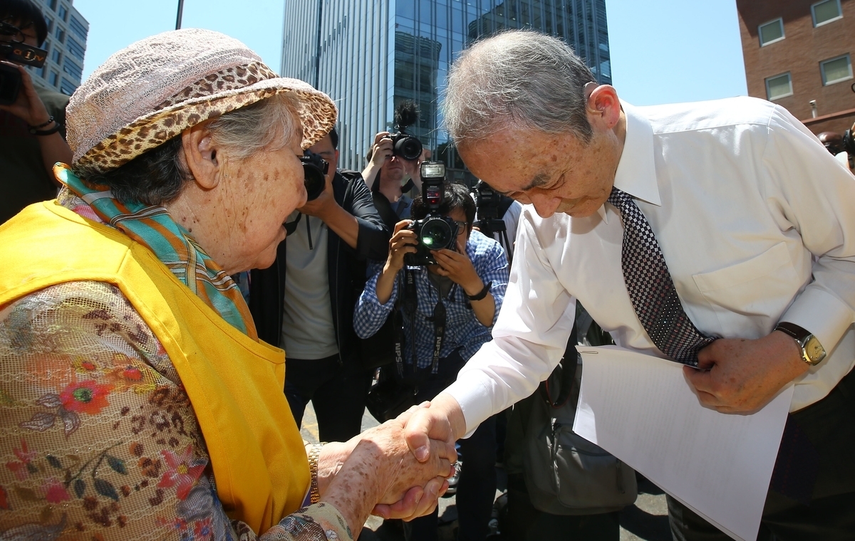2015년 길원옥 할머니에게 머리 숙여 사죄하는 무라오카 다카미쓰 네덜란드 레이던대 명예교수. 연합뉴스