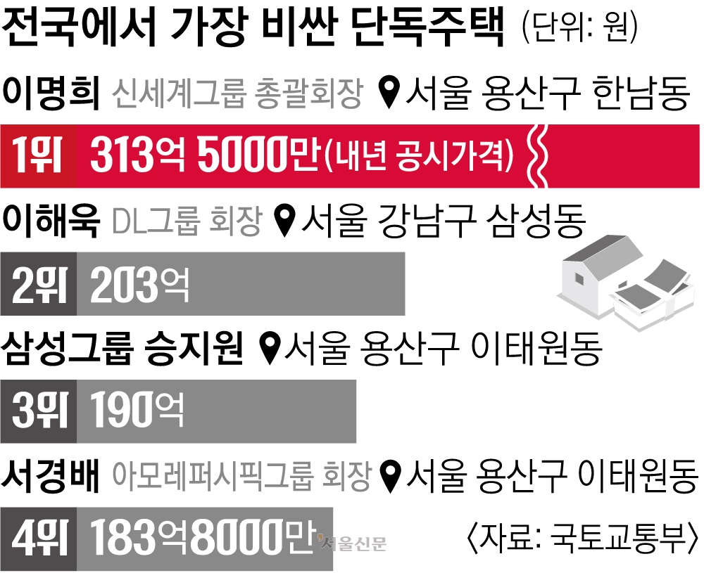 이명희 신세계그룹 총괄회장의 서울 용산구 한남동 자택이 11년째 공시가격이 가장 비싼 단독주택에 선정됐다. 서울 중구 명동의 네이처리퍼블릭 부지는 2004년부터 23년째 전국에서 ‘가장 비싼 땅’이란 지위를 지켰다.