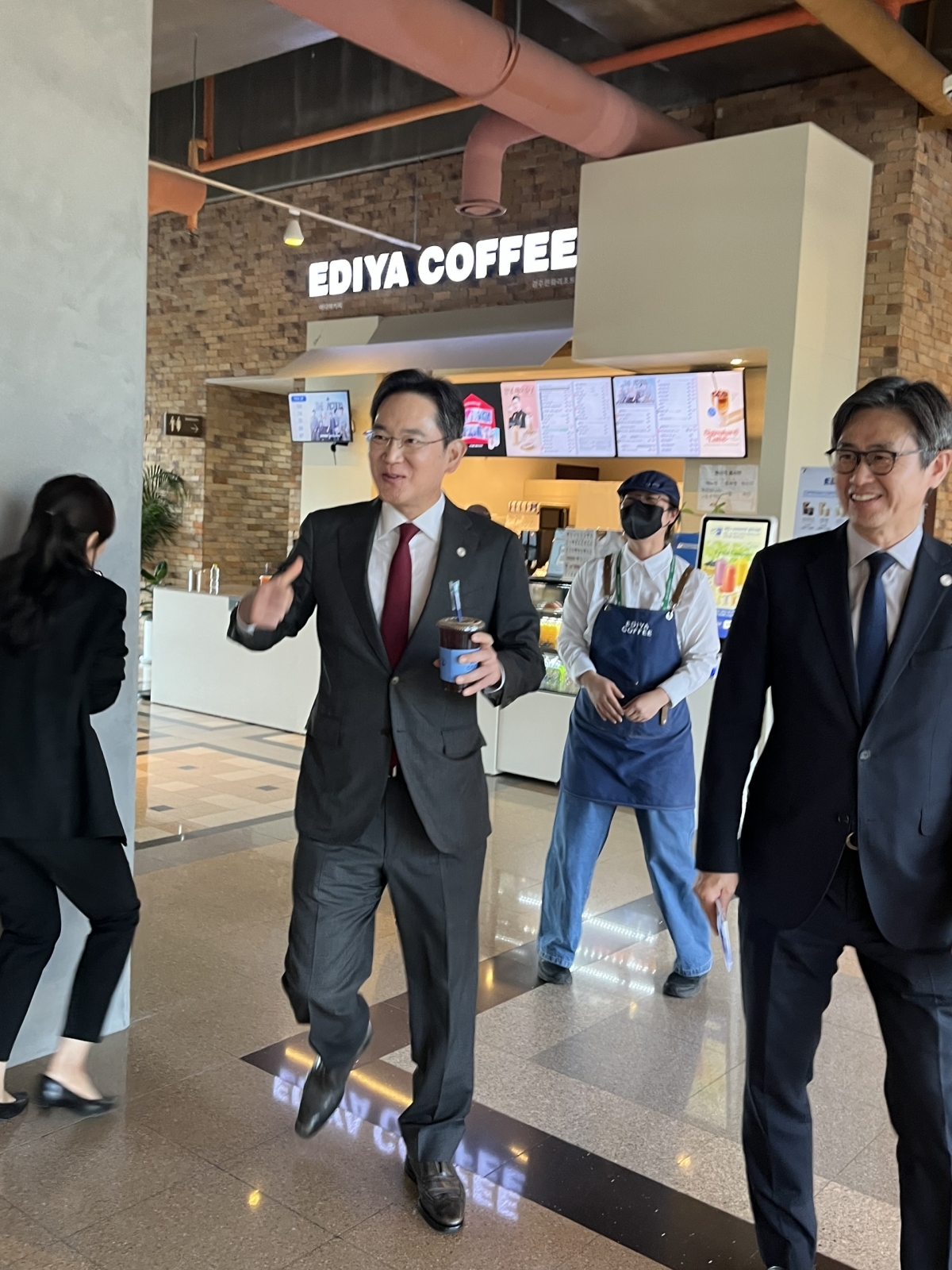 지난 1일 경북 경주 한화리조트 내 이디야커피 매장 앞에서 이재용(왼쪽 두 번째) 삼성전자 회장이 제갈모(세 번째)씨로부터 커피를 받은 뒤 이동하고 있다.