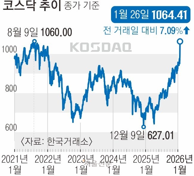 코스닥 지수가 26일 4년여 만에 ‘천스닥’(코스닥 1000)을 돌파했다. 하루 만에 6% 넘게 급등해 장 초반에는 과열을 진정시키기 위한 ‘매수 사이드카’(프로그램 매수 호가 일시 효력 정지)가 발동되기도 했다. 지난 22일 코스피가 꿈의 지수 ‘5000포인트’를 찍은 데 이어 국내 증시 강세가 이어지고 있다.