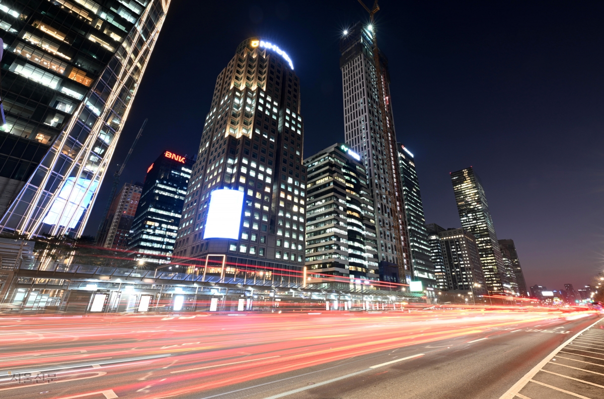 코스닥 지수가 26일 4년여 만에 1000선을 다시 밟으며 급등한 반면 코스피는 외국인과 기관 순매도에 밀려 4940선대로 내려앉았다. 사진은 서울 여의도 증권가 건물에 불이 밝혀진 모습.