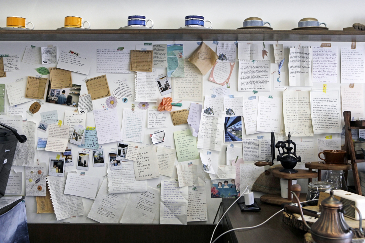 강원 춘천 ‘첫서재’를 다녀간 이들이 남긴 편지가 라운지의 양쪽 벽을 가득 메우고 있다. 세 가지 프로젝트가 끝난 지금도 편지를 남기는 이들이 많다.