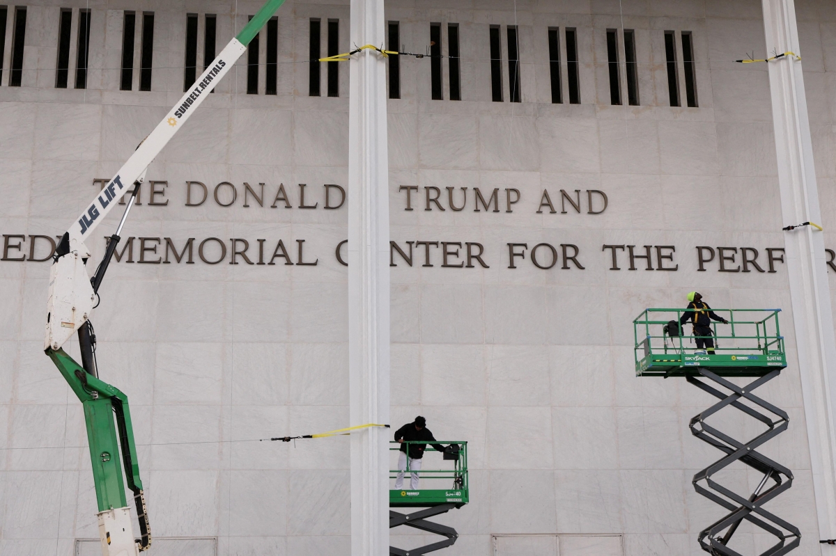 미국 워싱턴DC 대표 공연장 ‘존 F 케네디 센터’의 이름이 ‘트럼프-케네디 센터’로 변경되고 하루 뒤인 19일(현지시간) 외벽에 ‘도널드 트럼프’ 이름을 추가하는 작업이 진행되고 있다.