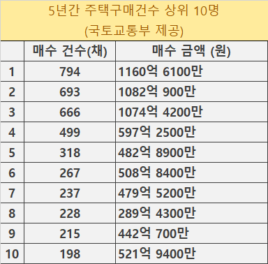이 가운데 상위 10명의 주택 매수 건수는 4115건, 매수 금액은 6639억 600만원이었다. 1인당 평균 411.5채를 약 663억 9000만원에 사들인 것이다. 1위 794건(1160억 6100만원), 2위 693건(1082억 900만원), 3위 666건(1074억 4200만원), 4위 499건(597억 2500만원), 5위 318건(482억 8900만원) 등 순이었다.