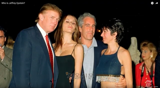 왼쪽부터 도널드 트럼프 미국 대통령, 멜라니아 트럼프 영부인(당시 여자친구), 제프리 엡스타인, 기슬레인 맥스웰 [뉴욕타임스 캡처]