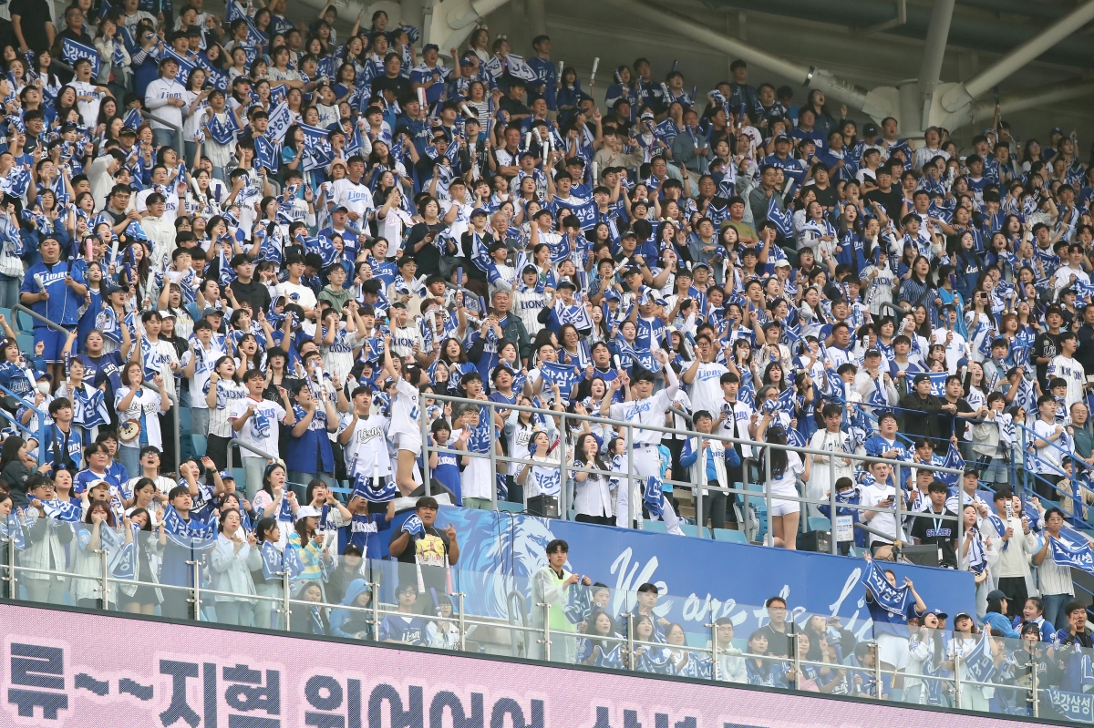 추석 연휴에 즐기는 가을야구 6일 오후 대구 삼성라이온즈파크에서 열린 프로야구 2025 신한 SOL뱅크 KBO 와일드카드 결정전 1차전, 삼성 라이온즈와 NC 다이노스의 경기를 찾은 야구팬들이 열띤 응원전을 펼치고 있다. 2025.10.6. 뉴스1