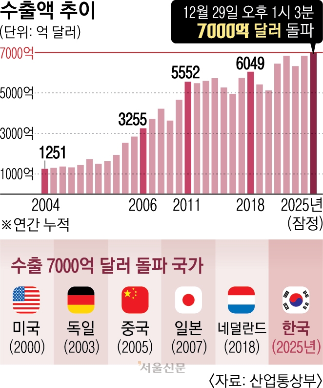 한국이 ‘수출 7000억 달러 클럽’에 이름을 올렸다. 미국·독일·중국·일본·네덜란드에 이어 세계 6번째다. 도널드 트럼프 미국 대통령의 ‘관세 전쟁’을 뚫고 달성한 신기록이란 점에서 더 의미가 크다는 평가가 나온다.