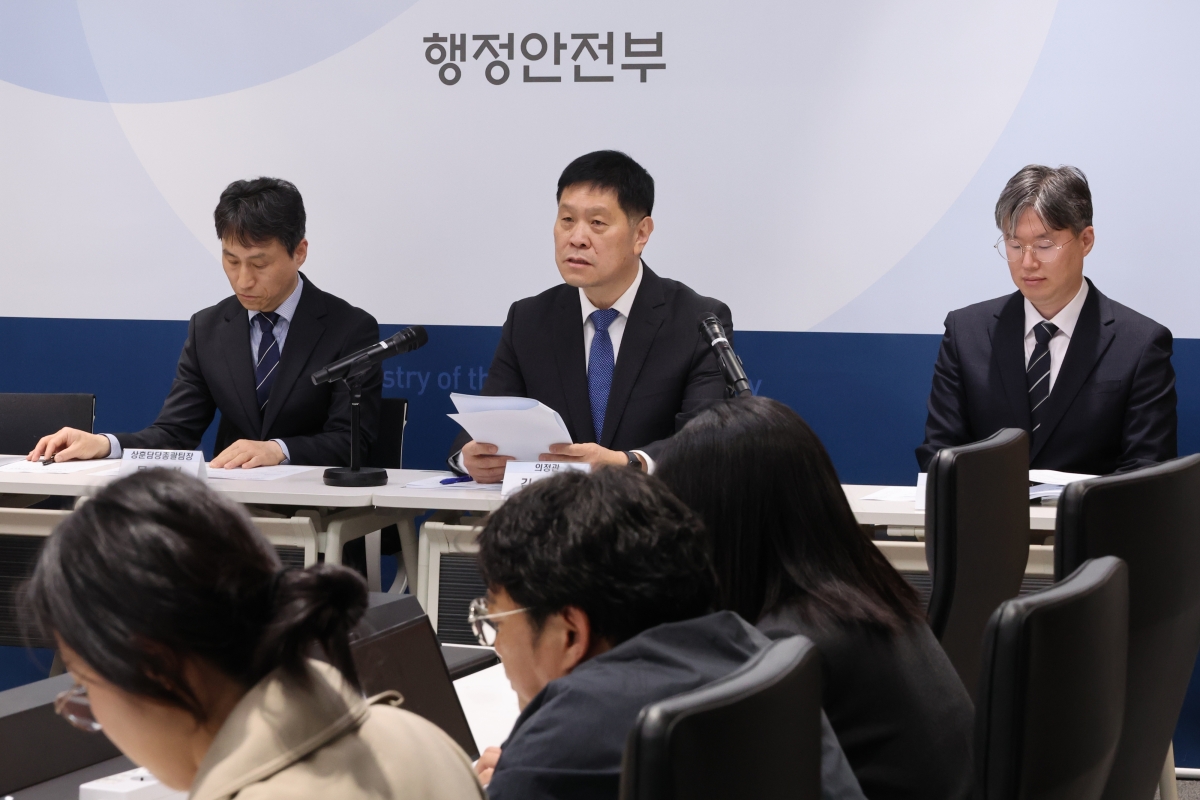 김영수 행정안전부 의정관이 13일 세종시 정부세종청사에서 부적절한 정부포상에 대한 전면 재검토 및 취소 추진방안을 설명하고 있다. 왼쪽부터 문호성 상훈담당팀장, 김영수 의정관, 박동민 사무관. 2026.4.13