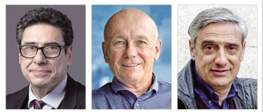 왼쪽부터 2025 노벨경제학상을 수상한 필리프 아기옹, 피터 하윗, 조엘 모키어.