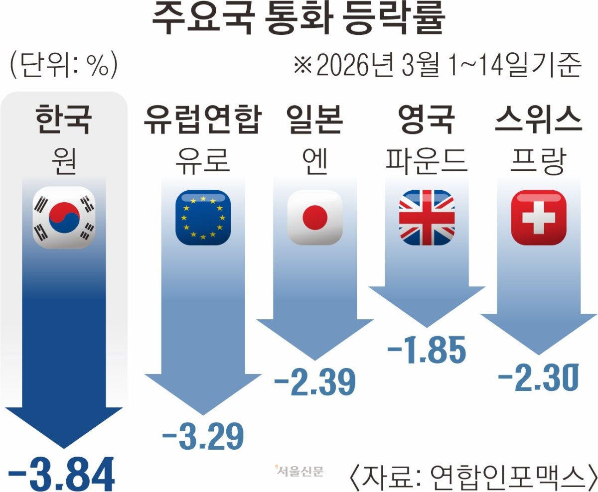 원화 가치 하락 폭이 다른 나라보다 큰 점도 특징이다. 이달 들어 14일까지 원화 가치는 3.84% 떨어졌다. 달러인덱스를 구성하는 주요 6개국 통화 가운데 유럽연합(EU) 유로(-3.29%), 일본 엔(-2.39%), 영국 파운드(-1.85%) 등도 약세를 보였지만 원화보다 하락 폭이 작았다. 스웨덴 크로나(-4.49%)만 원화보다 더 떨어진 것으로 나타났다.