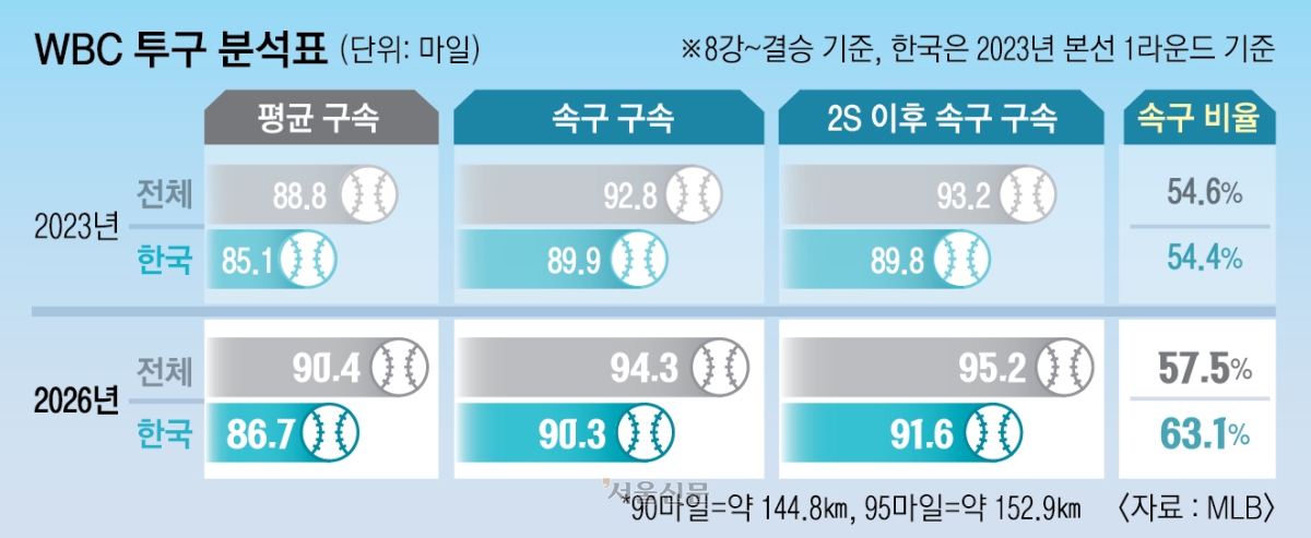 미국 프로야구 메이저리그(MLB) 통계에 따르면 올해는 3년 전에 비해 투수들의 구속 증가가 더 두드러졌다. 8강부터 결승까지 전체 구종 평균 구속은 시속 88.8마일(약 142.9㎞)에서 90.4마일(약 145.5㎞), 속구 계열은 92.8마일(약 149.3㎞)에서 94.3마일(약 151.8㎞)로 늘었다. 특히 2스트라이크 이후 결정구로 던진 속구는 93.2마일(약 150㎞)에서 95.2마일(약 153.2㎞)로 2마일 빨라졌다. 투수들은 속구 구사 비율도 54.6%에서 57.5%로 높였다.