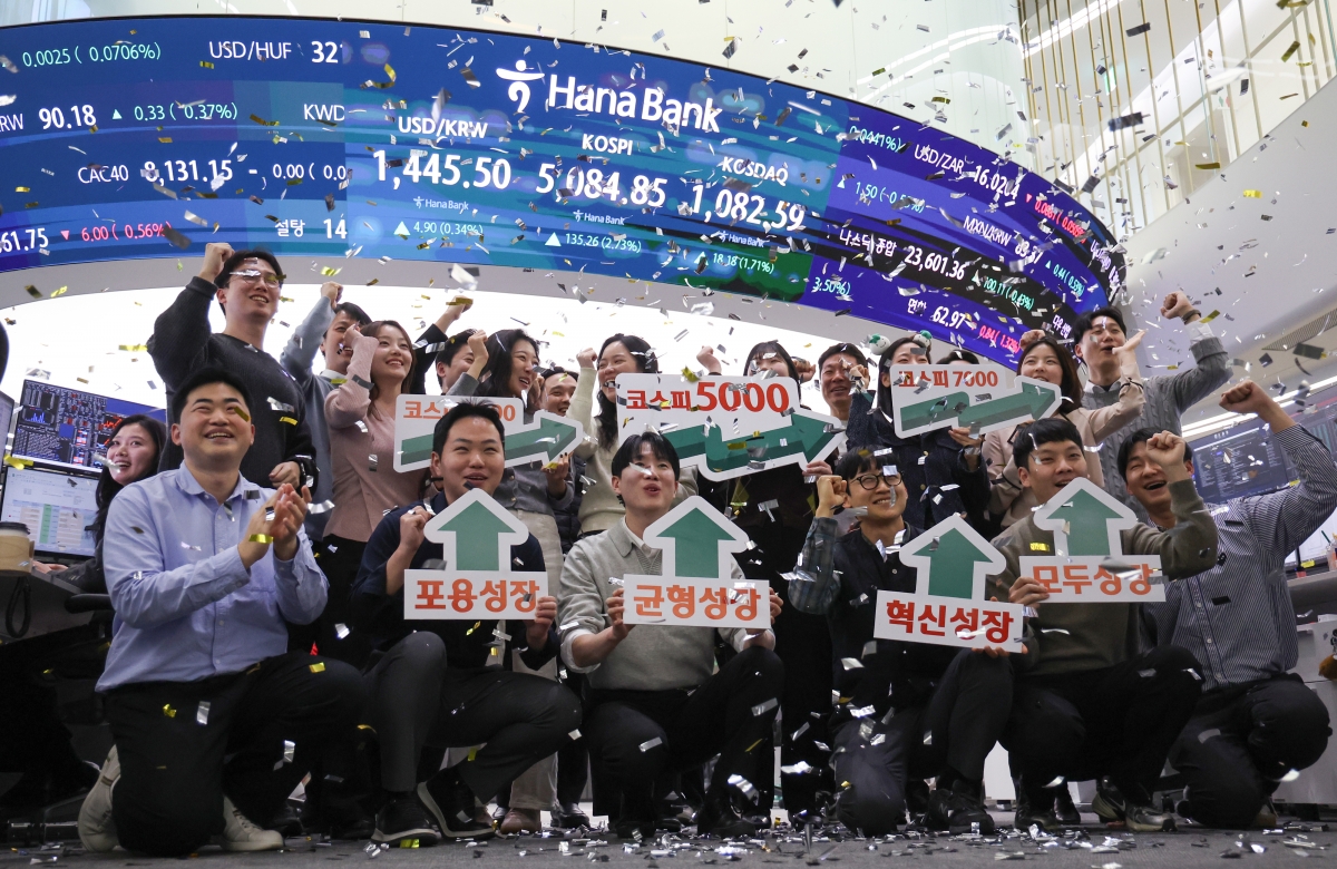 코스피지수가 종가 기준 5000선을 첫 돌파하고 코스닥도 1000선을 기록한 27일 서울 중구 하나은행 딜링룸에서 직원들이 기념 세레머니를 하고 있다. 연합뉴스