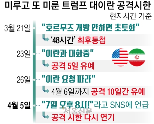 도널드 트럼프 미국 대통령이 이란과의 협상 시한을 하루 연장하고 호르무즈 해협을 개방하지 않으면 민간 시설인 발전소와 다리를 모두 폭파시키겠다고 위협했다. 지난달 21일 밝힌 ‘48시간 최후통첩’을 세 차례 연기한 것으로, 개전 6주 차에 접어든 중동전쟁이 중대 갈림길에 섰다는 분석이다.