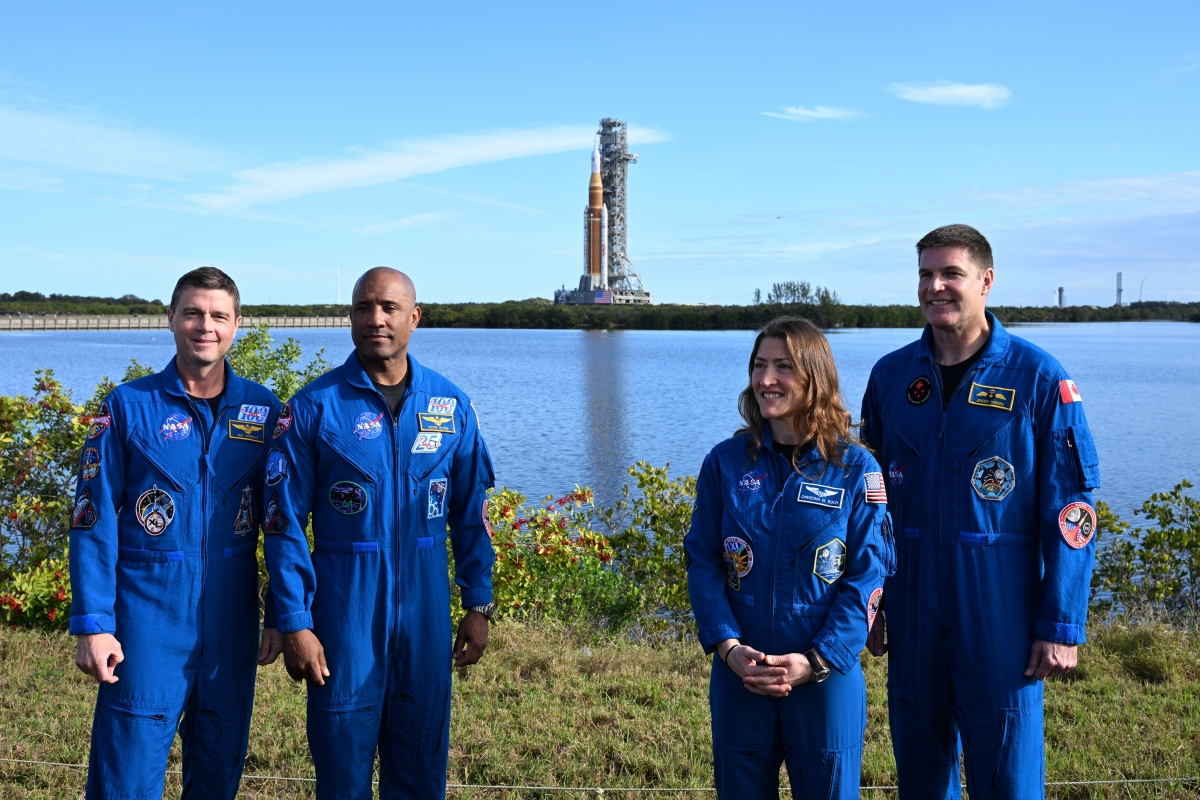 미국 항공우주국(나사)의 유인 달 탐사 프로젝트 ‘아르테미스 II’에 참가한 우주인 리드 와이즈먼(왼쪽부터), 빅터 글러버, 크리스티나 코크, 제러미 핸슨이 17일(현지시간) 케네디우주센터의 로켓 앞에 서 있다.