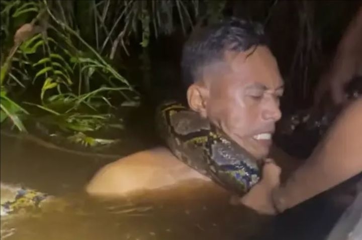 비단뱀의 주요 서식지인 인도네시아에서 한 남성이 몸 길이가 6m에 달하는 비단뱀에 목이 감긴 채 물속으로 끌려가는 아찔한 순간이 포착됐다.