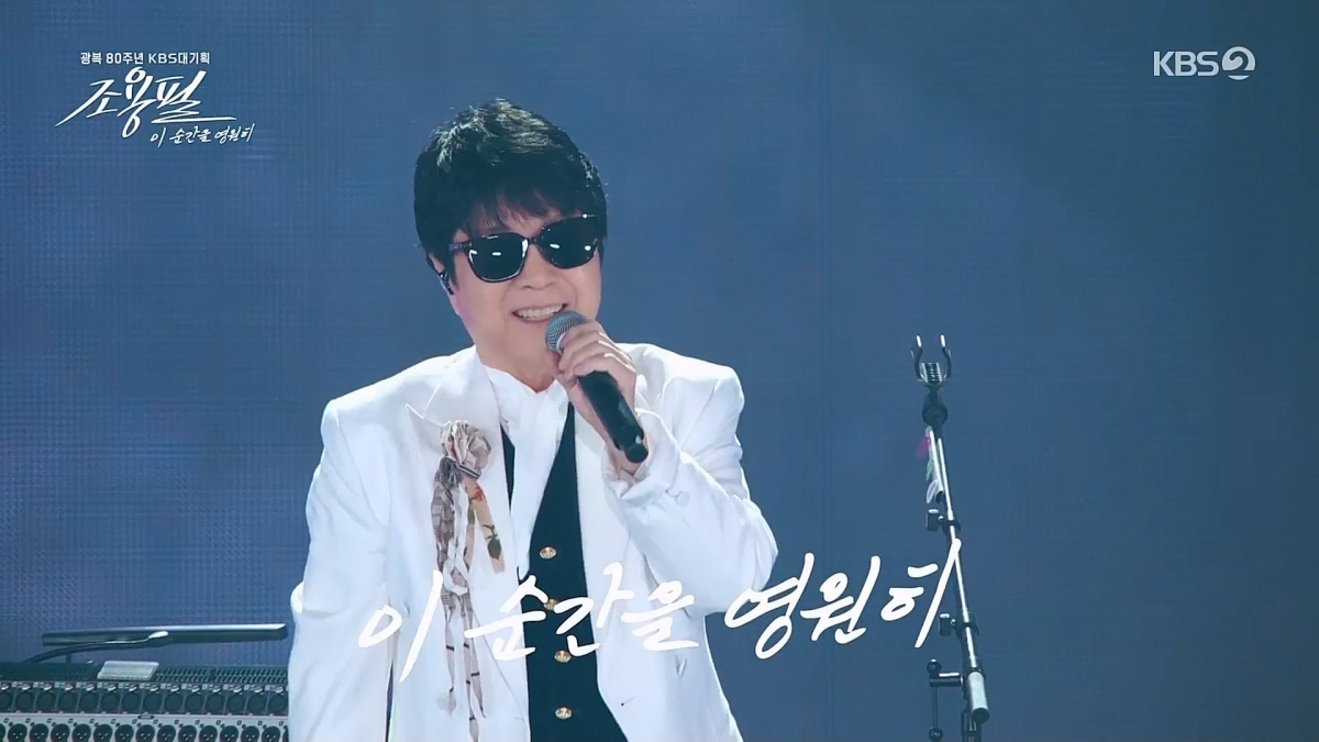 추석인 지난 6일 KBS에서 방영한 ‘광복 80주년 대기획-조용필, 이 순간을 영원히’에서 조용필이 열창하고 있다. KBS는 지난달 녹화한 조용필 단독 콘서트를 이날 연휴 특집으로 내보냈다.