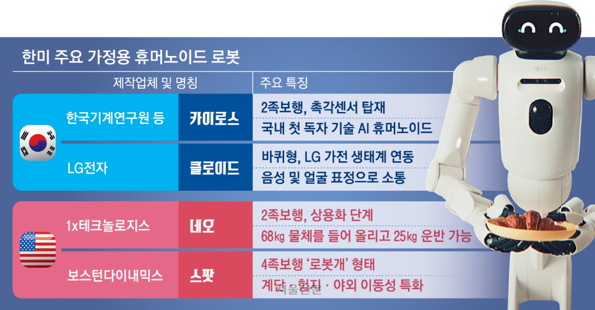 LG전자 ‘클로이드’ 고도화로 박차산업현장에서 활약하는 휴머노이드가 집 문 앞까지 왔다. ‘홈로봇’(가정용 로봇)이 집안일을 대신할 태세다. 하지만 ‘홈로봇 1가구 1로봇 시대’는 아직 이르다. 산업용 로봇이 독립 공간에서 일한다면, 홈로봇은 가족과 함께하는 만큼 안전하고, 유용하며 가격도 적정해야 한다. 미국은 지능을, 중국은 가격경쟁력을, 일본은 정밀부품을 앞세워 홈로봇 개발에 박차를 가하는 가운데 우리나라의 길을 탐색한다.