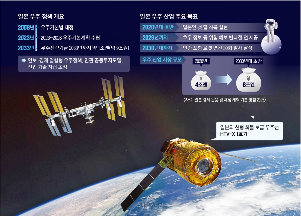 정부가 제시한 우주산업 목표는 구체적이다. 2030년대까지 민간을 포함한 연간 30회 로켓 발사, 타국 위치정보시스템(GPS)에 의존하지 않는 독자 위성항법 시스템의 순차적 구축, 2029년까지 ‘선형 강수대’ 예보 정확도 향상, 2020년대 후반 일본인 우주비행사의 첫 달 착륙 실현이 그것이다. 우주 산업 시장 규모는 2020년 4조엔(약 37조원)에서 2030년대 초반 8조엔(75조원)으로 두 배 확대를 목표로 한다. 이를 위해 일본은 2023년부터 2033년까지 1조엔(9조원) 규모의 ‘우주전략기금’을 차례로 투입하고 있다.